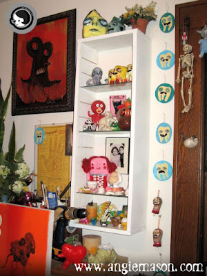 sponge soaking everything in sight…luckily I am a plastic box storing freakazoid. Other amazing stories from the studio days is I am currently testing new glazes out for my paintings since they stopped making the one I used 😦 arrgh… lots of tests still not happy with anything yet and trying so very hard to keep the fumes down… but I have a feeling that I am going to have take a deep breath get me some fumerific glazes…. I had been doing the forementioned tests and thought one was safe to use on an actual painting but as soon as I applied it I could see how it was turning intoa nightmare… getting chunky and wrinkling and just gross… not a pretty glaze at all I ran as fast as I could to the bathroom and gave my painting a shower…washing off that nasty glaze… On to more tests! Such is life. A corner of my world.. you can see lots of visual object I make that are also availble for you to purchase/adopt at my store…. ok well be sure to get your buttons on and other fun stuff on my shop! Stay dry and as always sweet dreams.