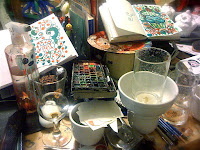 Some nights while working on artwork I take breaks to work on more stuff in my journal which you see some in this desk shot. It gets quite messy when I am working… I swear the rest of my house is not this kind of messy 😉 actually I am probably pretty anal about things being in their place… I guess chalk that up to being a visual person things have