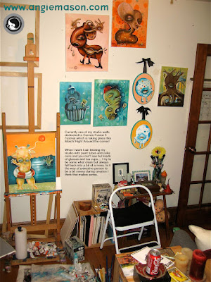 AAs you saw from my last post I am taking part in the amazing Fusion 5 Festival. Currently Spending pretty much any time I have working on new works to be done in such a short time I am running on high octane or something to keep my energy up to work work and work ^___^ Just finished with the Flu then bronchitis sooo i am hoping I am totally over being sick… I know a girl can dream but right now I am just focused on paints. typically when its a solo show I wouldn’t post any images of the work till the show … but Man i am just too excited for this show… and its an Art Festival not a solo show… even though I get my own room which is really a solo showing of sorts having my own angie world I will make within one of the amazing fucking brilliant rooms at Hotel 3-14 That place blows my mind! I think I should wear diapers when I go there since I am pretty sure when I see how beautiful everything is I will shit my pants with super happiness… Ok… soooo yes with that here is a photo of one of my walls in my studio that pretty much has a good bulk of the work for Cannes on it…. the other walls are TOP Secret for September’s solo show but can I tell you guys a secret the work for the September show is also getting me excited ^___^ I think its going to be a super great one! IN the mean time back to work for me… this is just in between some dry time. Babbling on this stupid box for some reason helps me not quite sure why… but I enjoy me a good day bloggin’ oh totally random memory recently on line at a supermarket the man in front of me was buying some funny items… 2 towels,a hammer and about boat load of bar soap. hmmmmm my mind can have some fun with that shopping list.