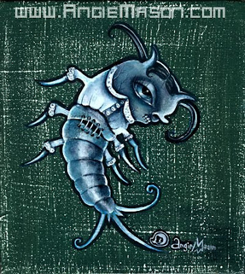 Here is a sneaky peak at one of my newer paintings I have been doing… this one is a little guy 8″X9″…. “SilverFish Girl”©2005 Angie Mason